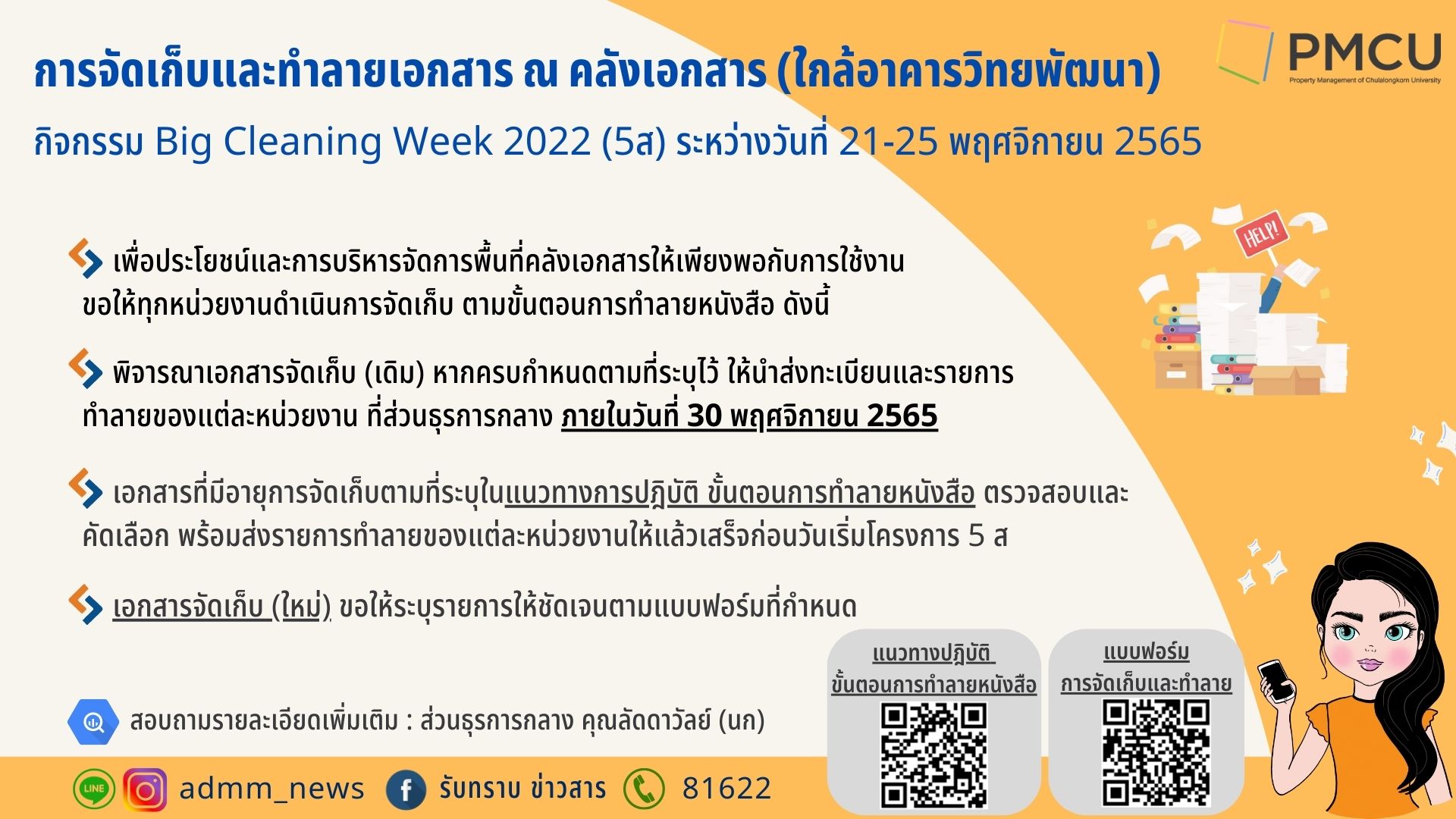 - พิจารณาเอกสารจัดเก็บ (เดิม) หากครบกำหนดตามที่ระบุไว้ ให้นำส่งทะเบียนและรายการทำลายของแต่ละหน่วยงาน ที่ส่วนธุรการกลาง ภายในวันที่ 30 พฤศจิกายน 2565