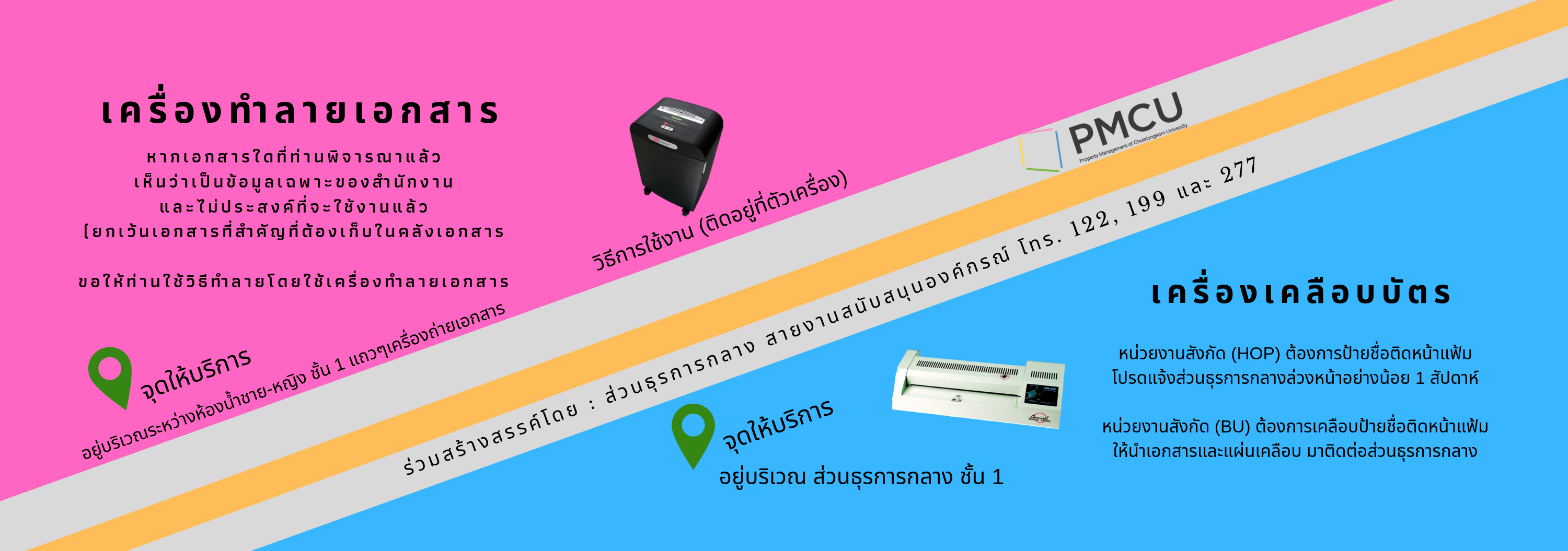 จุดให้บริการเครื่องทำลายเอกสารและเครื่องเคลือบบัตร By admin. news Posted 3 กรกฎาคม 2019 In News จุดให้บริการเครื่องทำลายเอกสารและเครื่องเคลือบบัตร2019-07-032019-07-03https://connect.pmcu.co.th/wp-content/uploads/2019/04/logo-PMCU-web.pngMy CMShttps://connect.pmcu.co.th/wp-content/uploads/2019/07/unnamed-file.png200px200px เรียน ผู้บริหารและพนักงานทุกท่าน เพื่อโปรดทราบ จุดให้บริการเครื่องทำลายเอกสารและเครื่องเคลือบบัตร admin. news Recent Posts🚘 ตารางการเดินรถประจำเดือนมีนาคม 2569เฉพาะช่วงวันที่ 26 ก.พ. 69 – 5 มี.ค. 69 เท่านั้นด้วย รศ.ดร.สิทธิเดช พงศ์กิจวรสิน รองอธิการบดีเดินทางไปปฏิบัติงาน ณ ประเทศญี่ปุ่น ระหว่างวันที่ 1 – 7 มีนาคม 2569ทำความสะอาดเครื่องปรับอากาศ (HOP ชั้น 1 – 2)