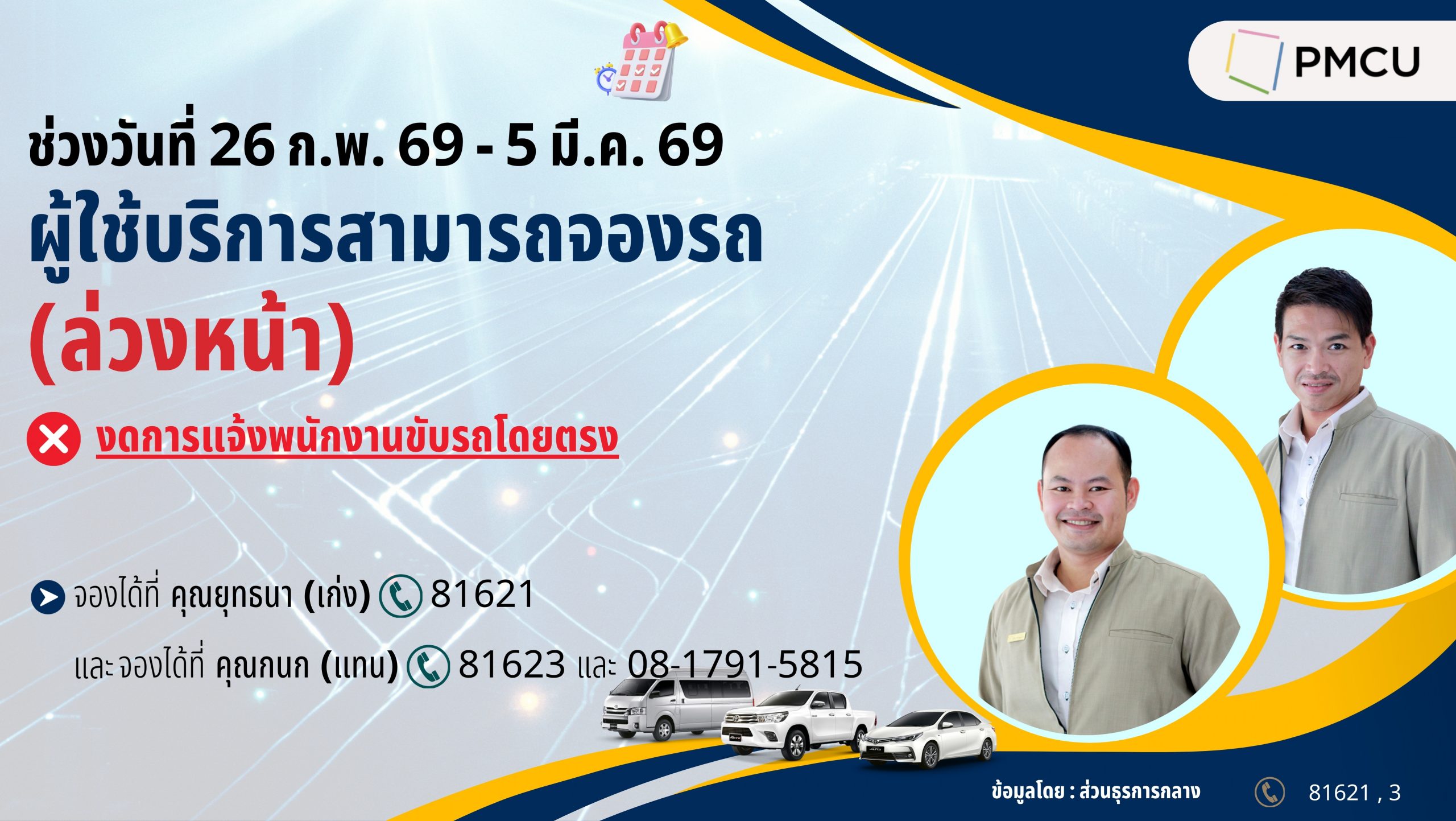 - จองได้ที่ คุณกนก (แทน) โทร. 81623 และ โทร. 08-1791-5815