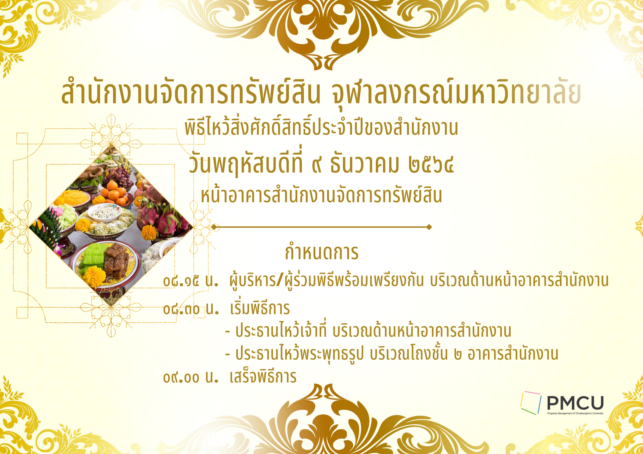 กำหนดการพิธีไหว้สิ่งศักดิ์สิทธิ์ประจำปีของสำนักงาน วันพฤหัสบดีที่ ๙ ธันวาคม ๒๕๖๔ หน้าอาคารสำนักงานจัดการทรัพย์สิน (รายละเอียดตามรูป)