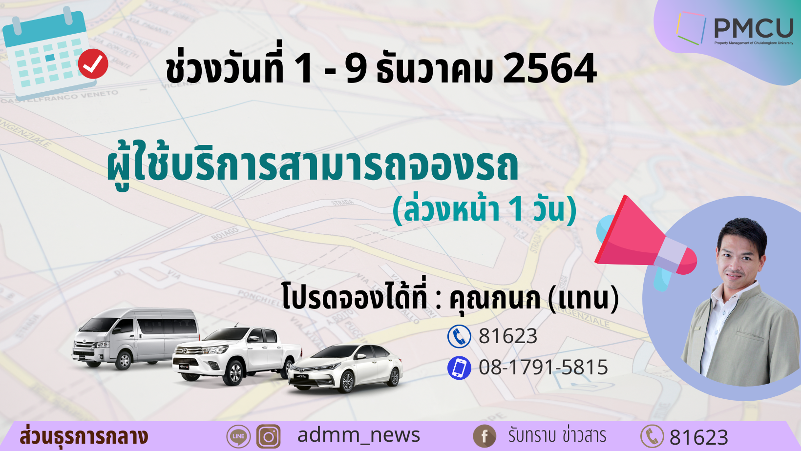 ช่วงวันที่ 1 – 9 ธันวาคม 2564 ผู้ใช้บริการสามารถจองรถ (ล่วงหน้า 1 วัน) โปรดจองได้ที่ : คุณกนก (แทน)