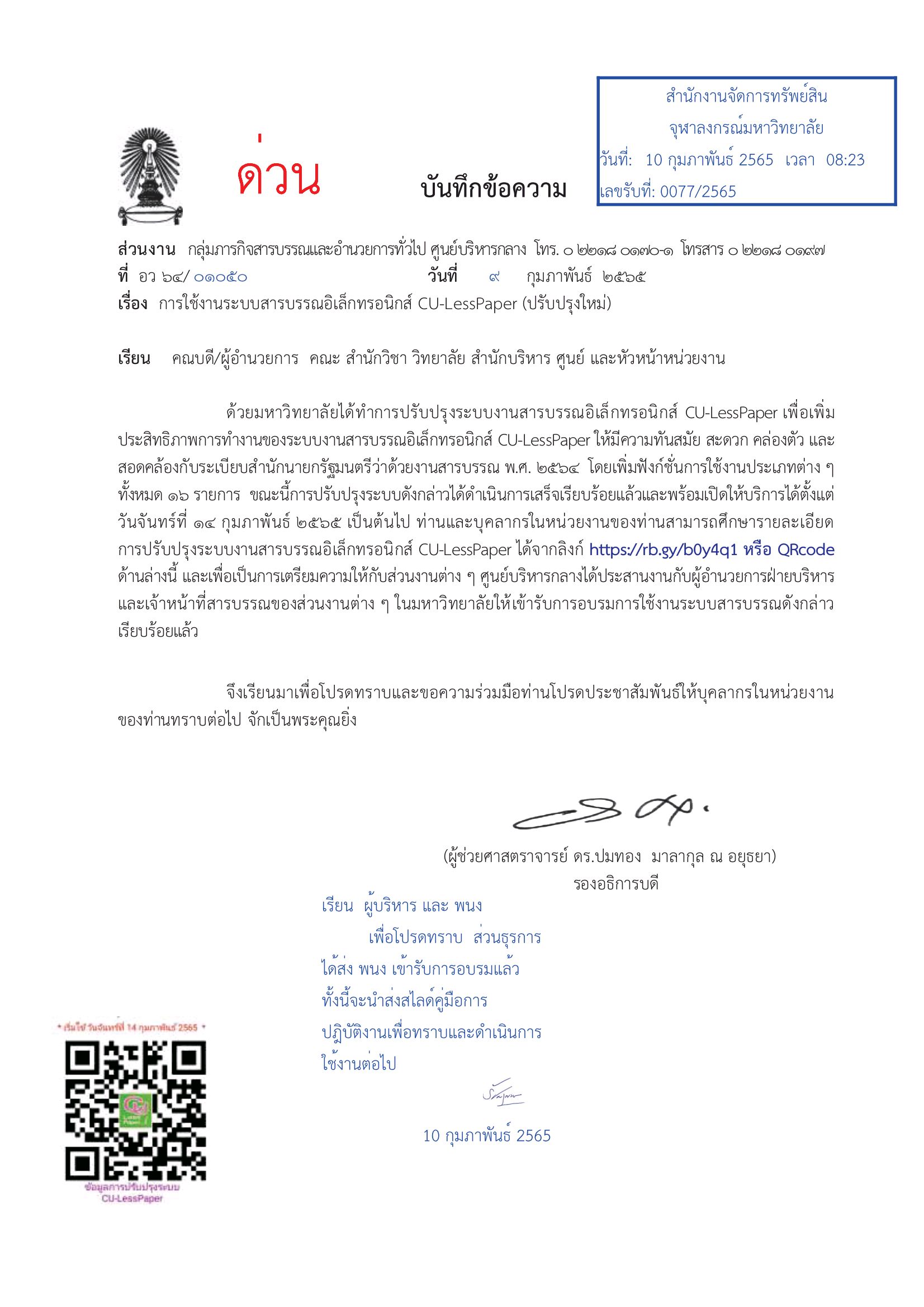 เรื่องการใช้งานระบบสารบรรณอิเล็กทรอนิกส์ CU-Less Paper (ปรับปรุงใหม่) เริ่ม 14 ก.พ. 65 เป็นต้นไป