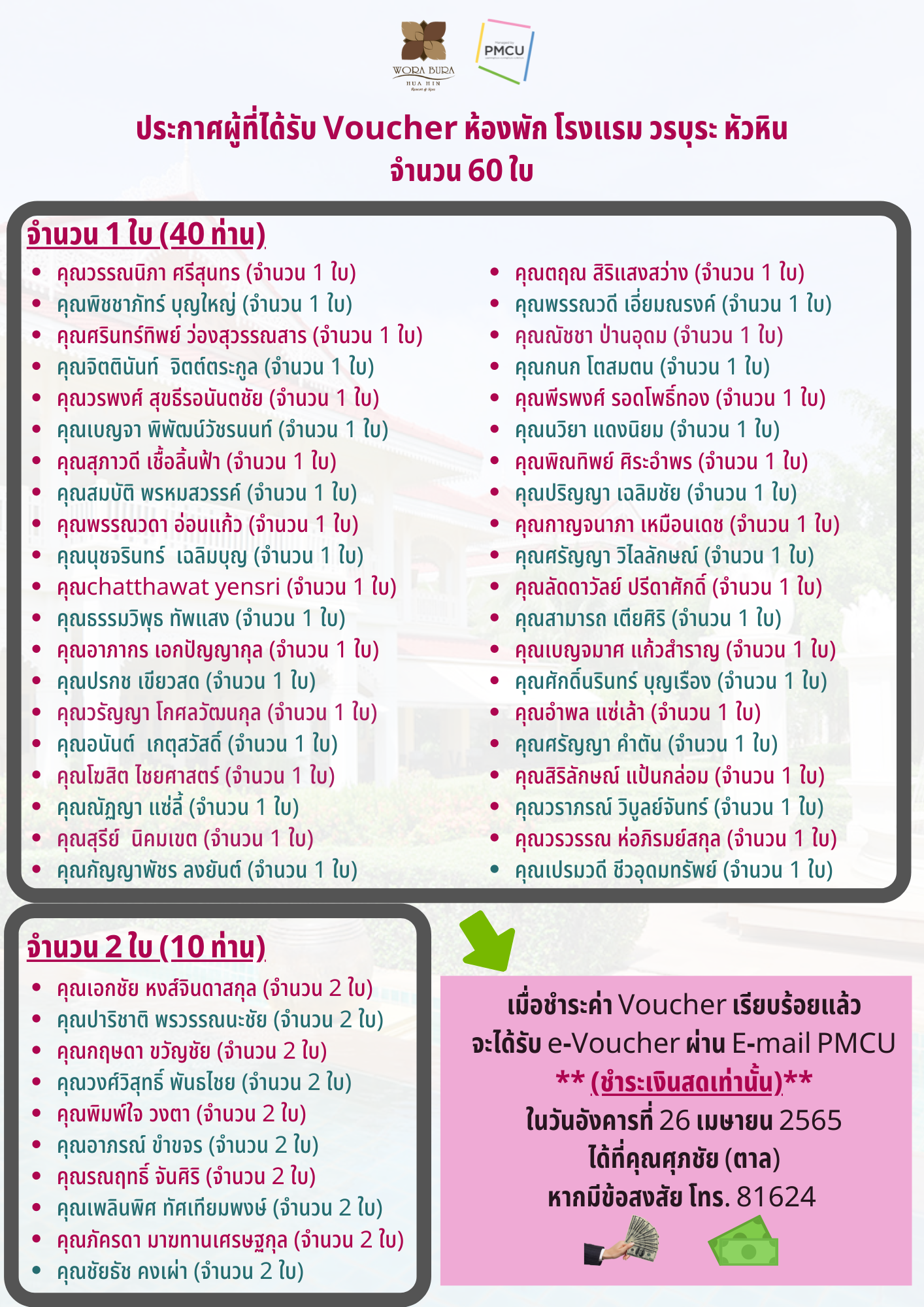ประกาศผู้ที่ได้รับ Voucher ห้องพัก โรงแรม วรบุระ หัวหิน (จำนวน 60 ใบ)