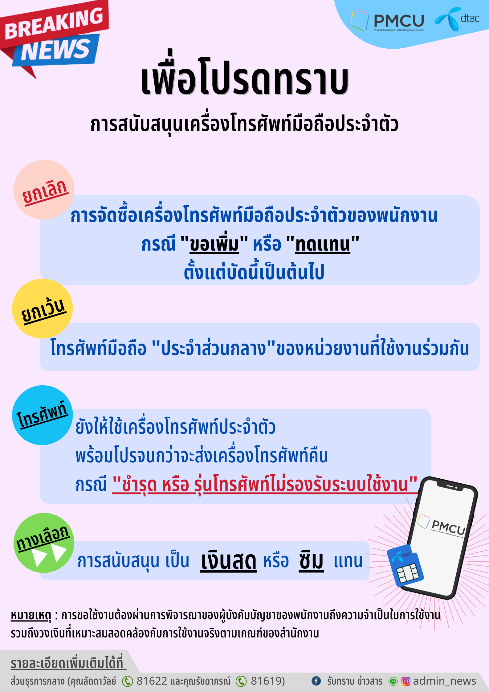 1. ยกเลิก “การจัดซื้อเครื่องโทรศัพท์มือถือประจำตัวของพนักงานกรณี “ขอเพิ่ม” หรือ “ทดแทน” ตั้งแต่บัดนี้เป็นต้นไป