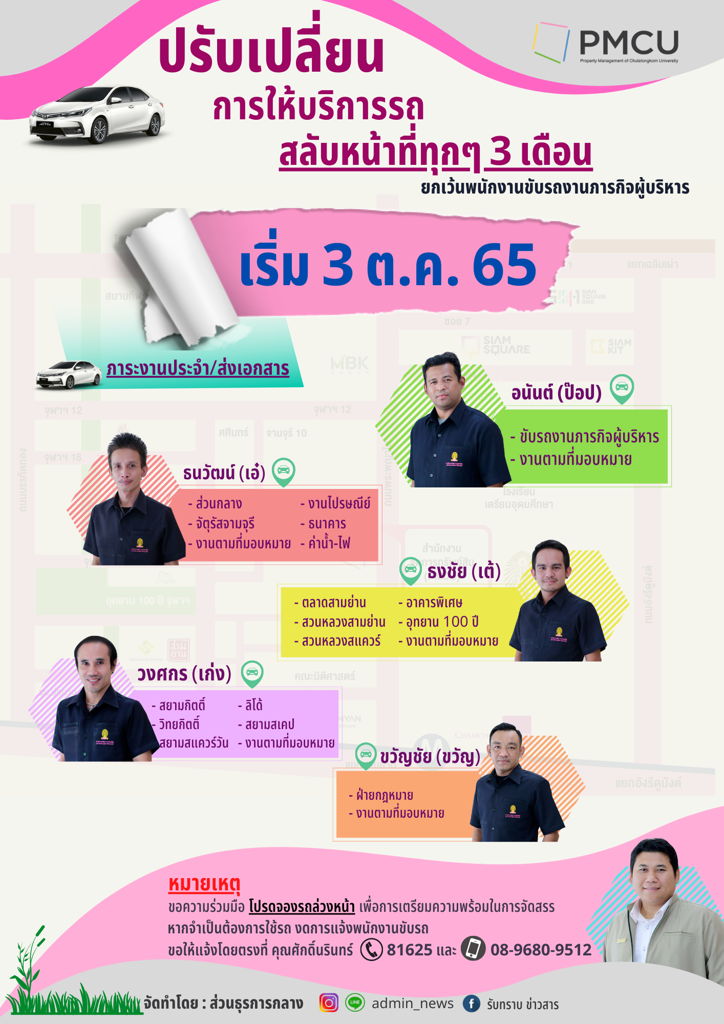 3 ตุลาคม 2565 ปรับเปลี่ยนการให้บริการรถ สลับหน้าที่ทุกๆ 3 เดือน (ยกเว้นพนักงานขับรถงานภารกิจผู้บริหาร)