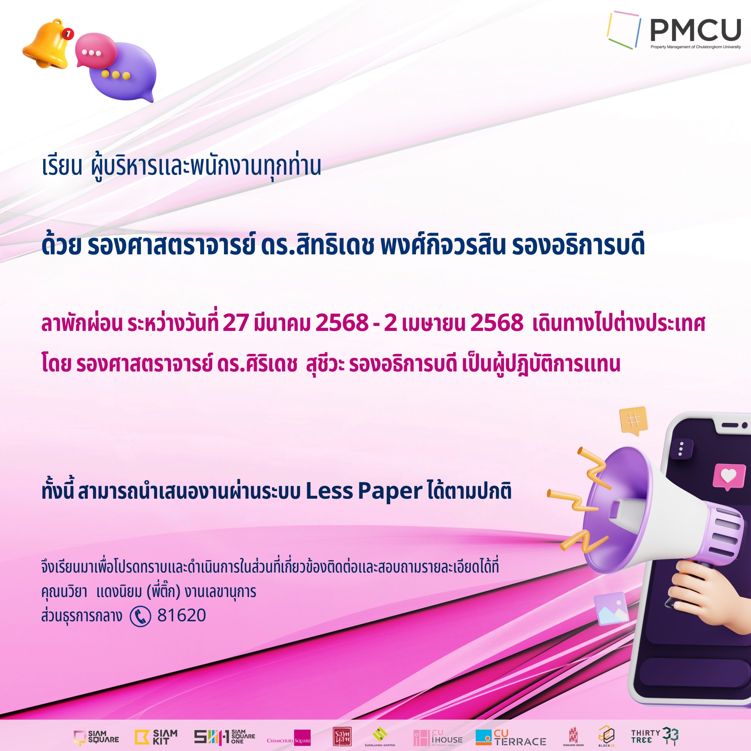 ลาพักผ่อน ระหว่างวันที่ 27 มีนาคม 2568 – 2 เมษายน 2568 เดินทางไปต่างประเทศ