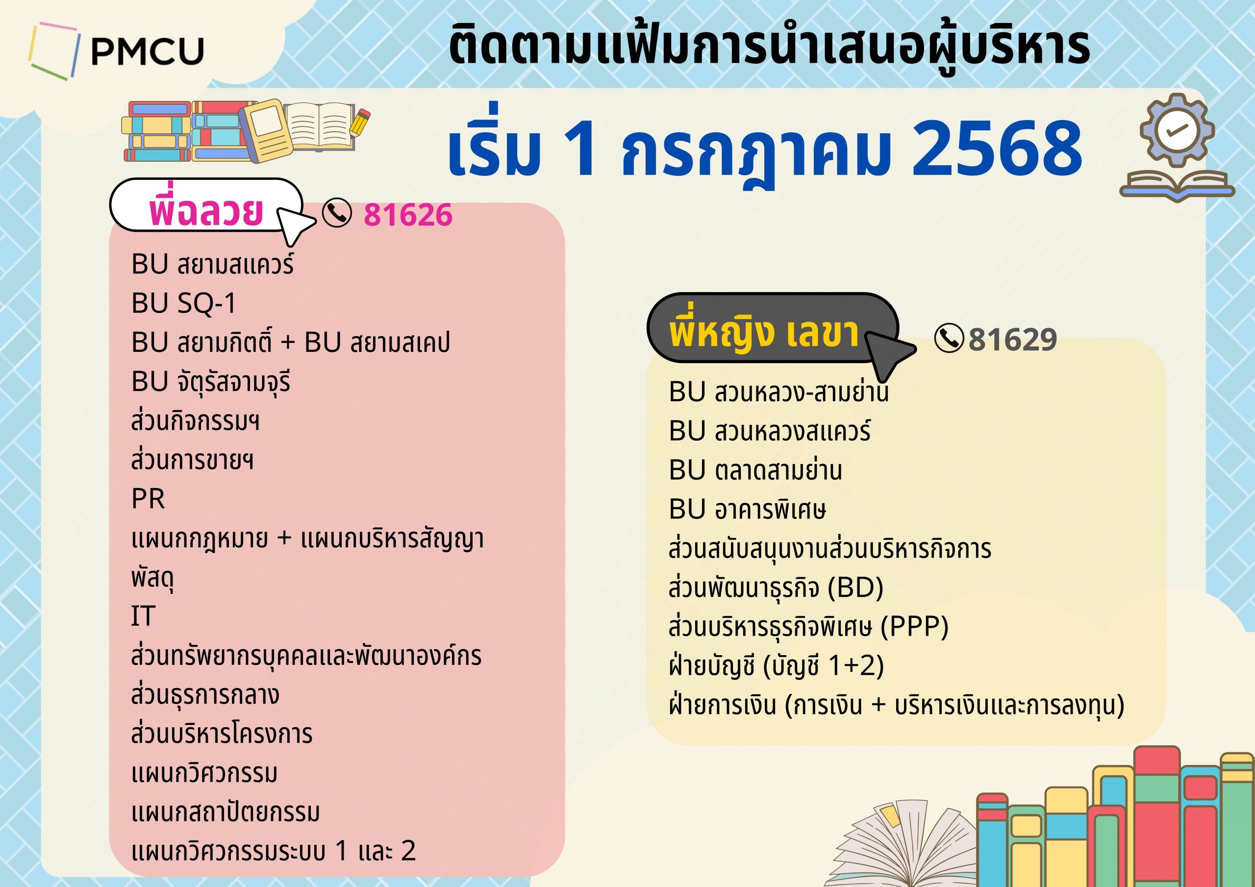 ส่วนกิจกรรมฯ / ส่วนการขายฯ / PR / พัสดุ / IT / ส่วนทรัพยากรบุคคลและพัฒนาองค์กร / ส่วนธุรการกลาง / ส่วนบริหารโครงการ