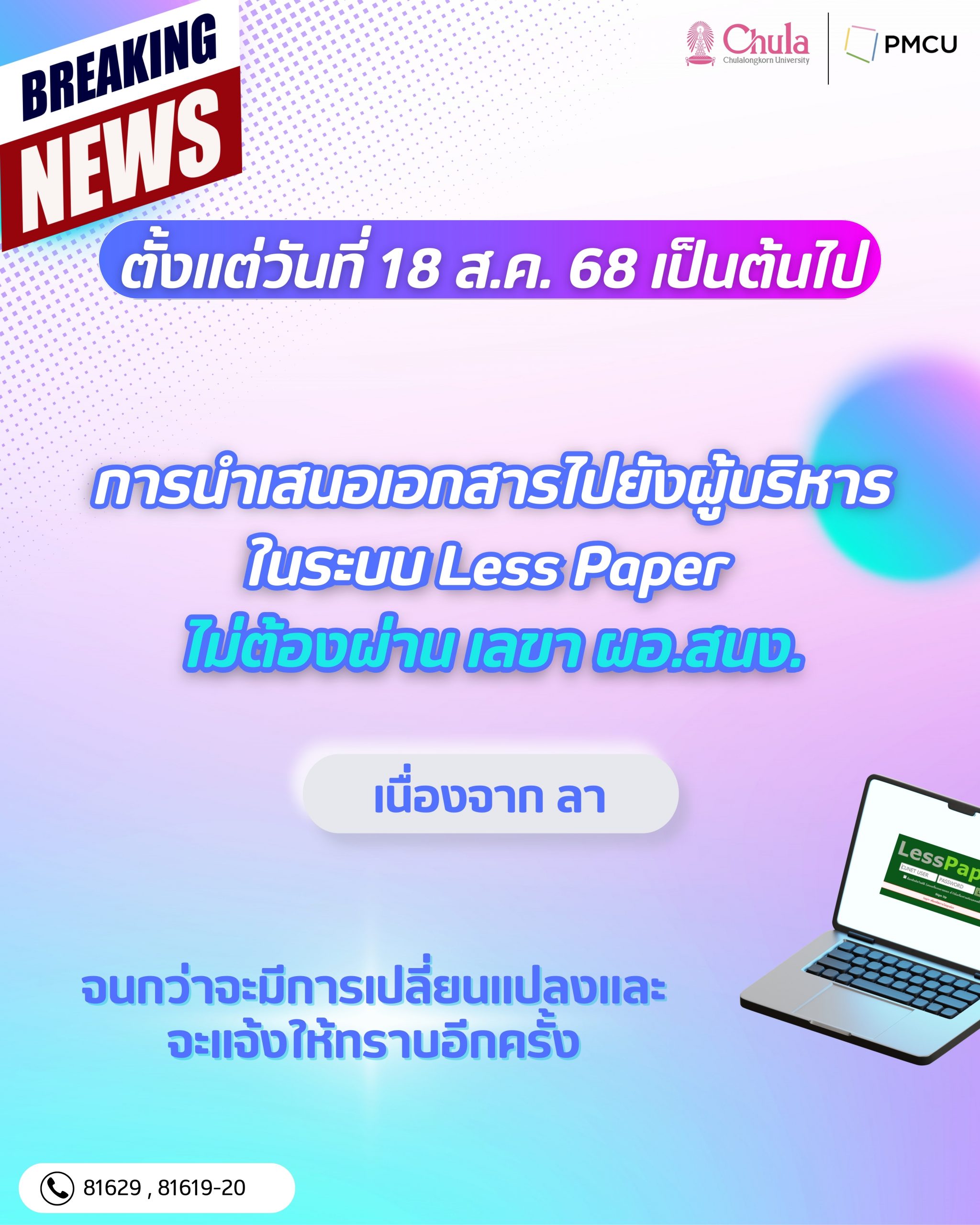 Breaking News การนำเสนอเอกสารผ่านระบบ Less Paper ตั้งแต่วันที่ 18 ส.ค. 68 เป็นต้นไป